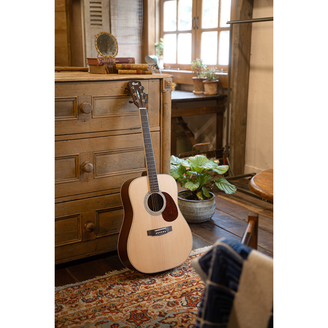 As Cort’s homage to the great vintage acoustic guitars, the Earth Series represents the look, sound, feel and playability of those fine instruments with uncompromising quality and excellent value. Ideal for both flatpicking and fingerstyle players, Earth100 features time-tested classic materials like solid spruce top, mahogany back and sides. Finish: Natural Satin CONSTRUCTION Dovetail Neck Joint BODY Dreadnought Body NUT WIDTH 43mm (1 11/16") TOP Solid Sitka Spruce Top BACK & SIDES African Mahogany(Okoume) NECK M ahogany(Palaquium) FRETBOARD Ovangkol FRETS 20 Frets SCALE 643mm (25.3") INLAY Dot Inlay ROSETTE Multiple Abalone Rosette BRIDGE Ovangkol STRINGS D'Addario EXP16 Strings SPECIAL Genuine Bone Nut & Saddle Sonically Enhanced UV Finish