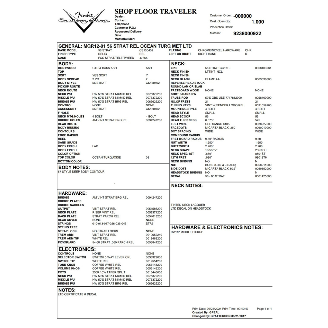 Meget pent brukt Fender Custom Shop ltd. edition Stratocaster i Ocean Turquoise. All "relic" er fra fabriken. Denne har en nyddelig flamelønnhals og Abigail Ybarra handwound pickuper. 3300g på kjøkenvekten. Kommer med CoA og alt av Case Candy. 10/56 V halsprofil. Se siste bilde for alle spesifikasjoner.
