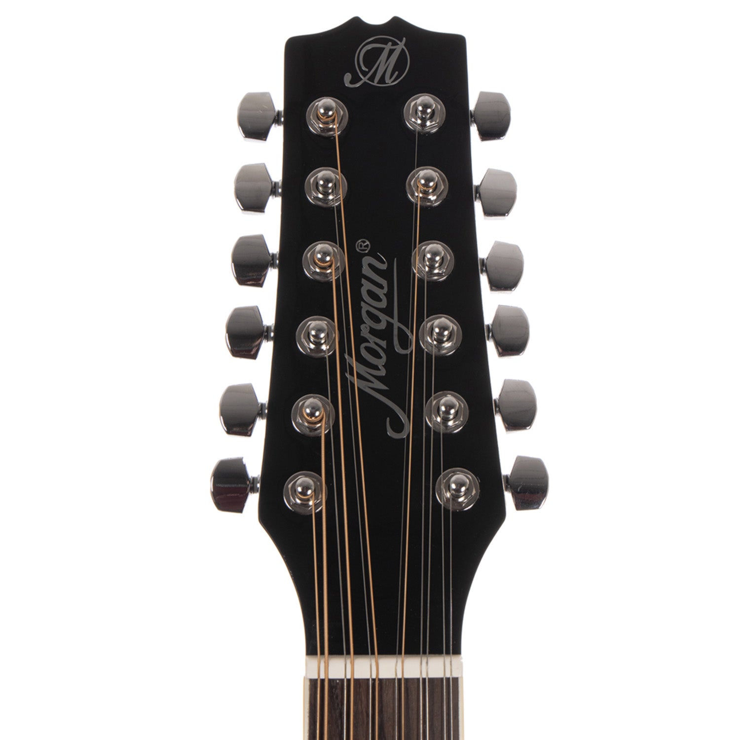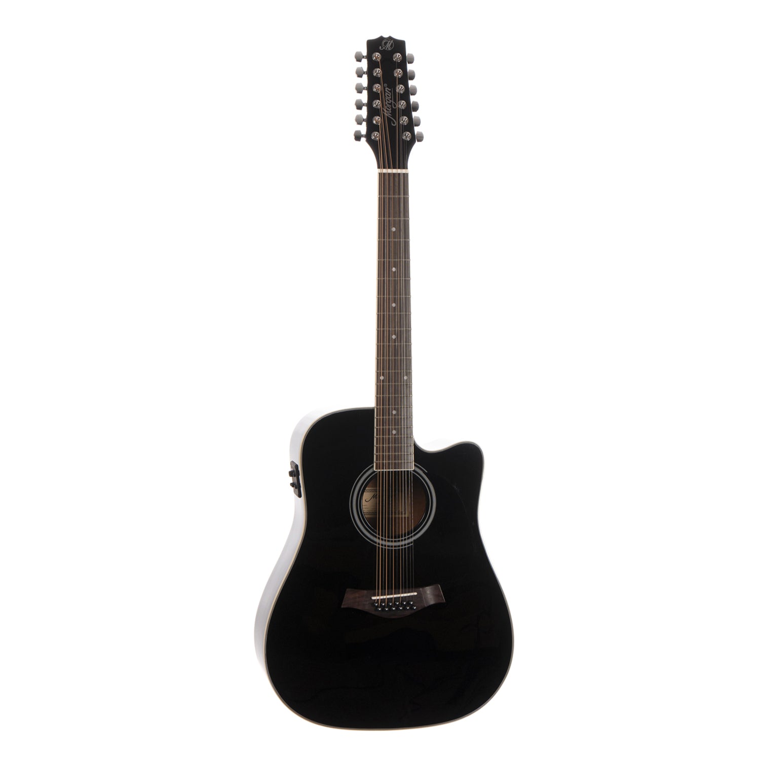 Tøff sort 12-strengersgitar med cutaway og pickupsystem.