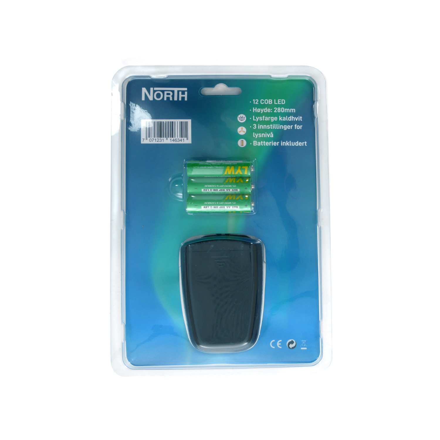 Høyde: 280mm Lysfarge kaldhvit 3 innstillinger for lysnivå Batteri inkludert