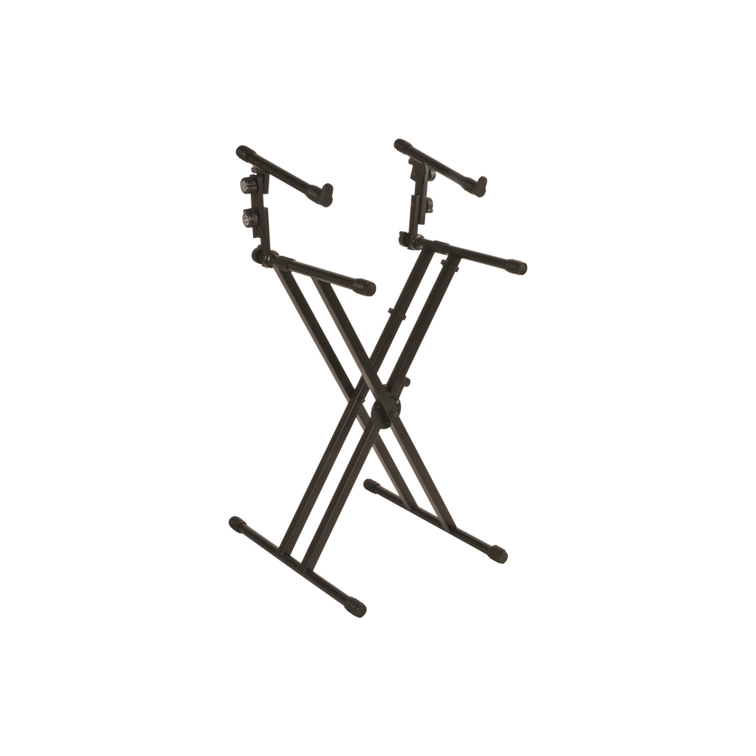 Heavy duty, double-brace "X" with height angle, tilt and depth adjustable second tier. Leg depth: 66 cm Main Tier depth: 42.5 cm Main tier height positions: 96.4 cm Second Tier depth: 41 cm Second Tier angles: 90°, 77°, 64°, 51° Folded height: 102.7 cm Overall Weight capacity: 120 kg 2nd tier weight capacity: 33.7 kg Weight: 10 kg Brace tube size: 30 x 30 mm (x2) Main tier tube size: 30 mm Color: Black Options: QLX/1, QLX/3, QLX/4, QLX/5, LPH/X, IPS/11, IPS/13