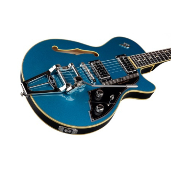 The Starplayer III comes in three elegant colors. A classic all over black and the two metallic finishes Catalina Blue and Catalina Red. All feature our deluxe 5-ply cream binding and a transparent burst on the back that shows the flamed maple shimmer through the finish.